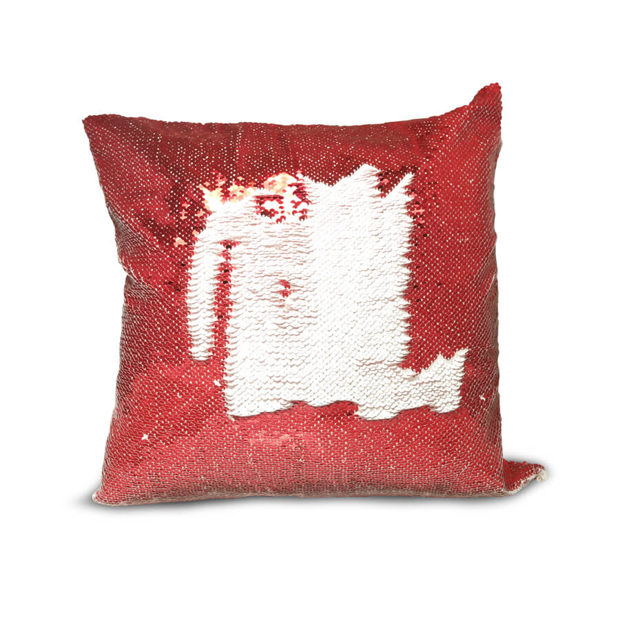 Fotopoduszka kwadrat z cekinami czerwona o wymiarach 40×40 cm. Poduszka zawiera wypełnienie.
